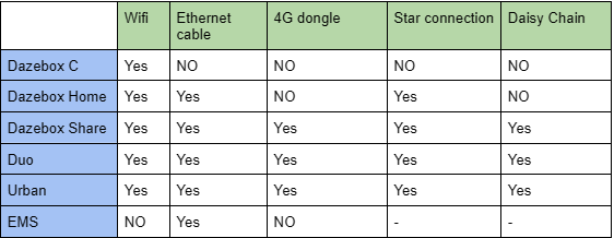 I caricabatterie Daze, a seconda del modello, hanno diverse possibilità di connessione a internet, di seguito una tabella riassuntiva delle tre modalità possibili (ethernet, wifi e 4G) in base al caricabatterie: